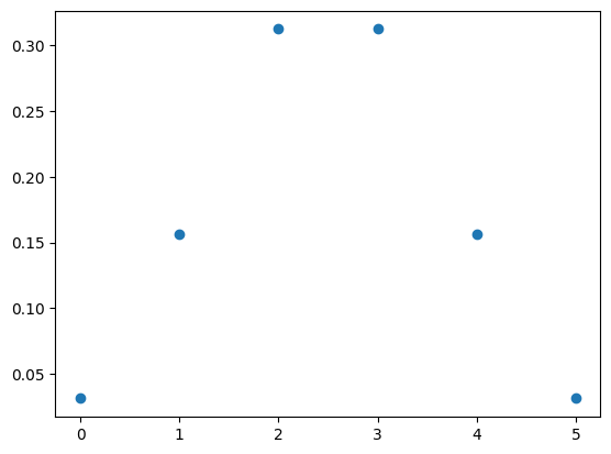 array([0.03125, 0.15625, 0.3125 , 0.3125 , 0.15625, 0.03125])
