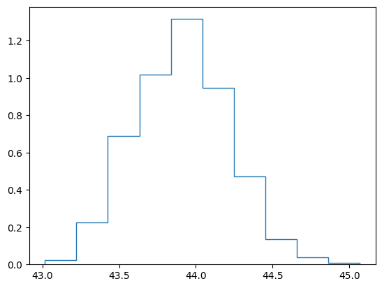 means[r] = np.mean(rx)plt.hist(means, density = True, histtype = "step");