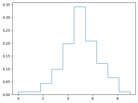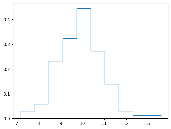 cms[r] = np.mean(bx)plt.hist(cms, density = True, histtype = "step");