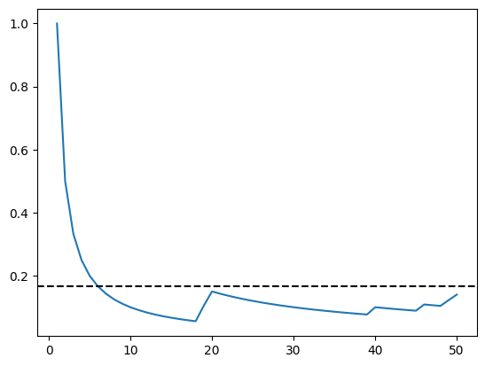 plt.axhline(1 / 6, color = "black", linestyle = "--") # 3.5