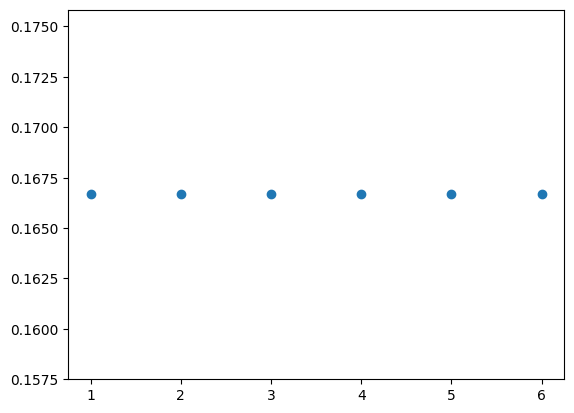 plt.scatter(np.arange(1, 7), np.ones(6) / 6) # density plot