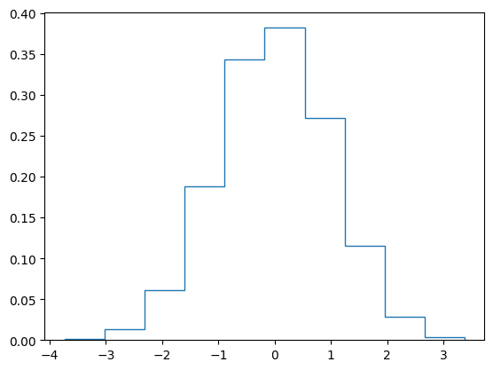 x = rng.normal(size = 10000)plt.hist(x, density = True, histtype = "step");