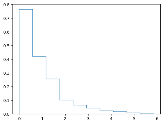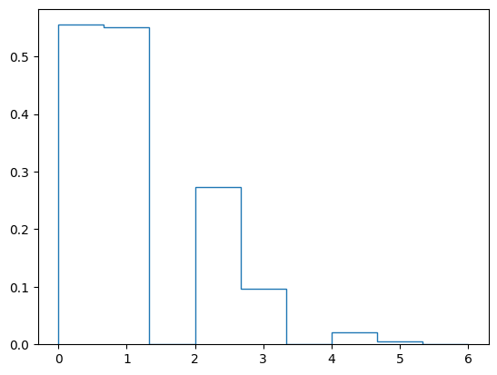 z = rng.poisson(size = 10000)plt.hist(z, density = True, histtype = "step", bins = 9);