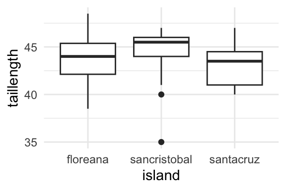 The median tail length for finches from Floreana is about 44mm. The minimum tail length for finches from San Cristobal is about 35mm. The third quartile of tail length for finches from the island Santa Cruz is about 44mm.