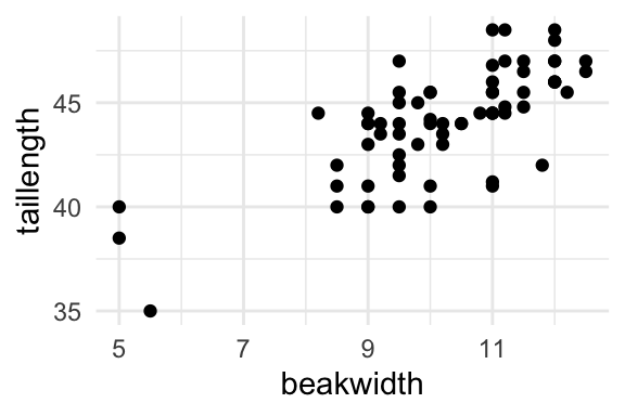 Consider a data set about finches (little birds) from the Galapagos islands. We’ll consider the variables beakwidth measured in millimeters (mm), taillength also in mm, and island.