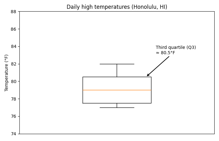 From the daily high temperature data above, a 95% confidence interval is (77.7, 80.6) degrees F. Interpret this confidence interval in context of these data.